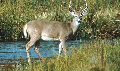 White-tailed deer are tan or brown in the summer and grayish brown in winter. The have white on their throats, around their eyes, and nose, on their stomachs and on the underside of their tails. Males have antlers. Males weigh between 150 and 300 pounds and female weigh between 90 and 200 pounds.